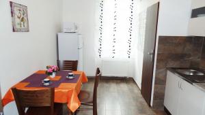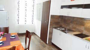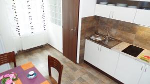 Apartmán disponuje s velkou samostatnou kuchyní (chladnička s mrazákem, minibar, nádobí, indukční varná deska, varná konvice, mikrovlnná trouba, kávovar). Koupelna - sprchový kout, vysoušeč vlasů, osušky. Samostatné WC. Možné snídaně na objednávku s donáškou na apartmán.
